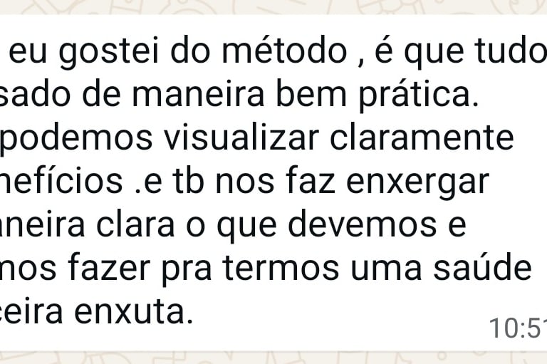 O método Dinhcontrol foi simplesmente libertador,me ajudou demais a evitar dividas desnecessárias, eu gastava horrores, era desorganizada demais. Depois do método, eu tenho outro modo de vida. Antes, se eu visse uma pena voando supérflua, eu comprava. Agora não.”